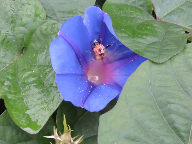 アサガオに潜り込むミツバチ発見。これはシャッターチャンス。